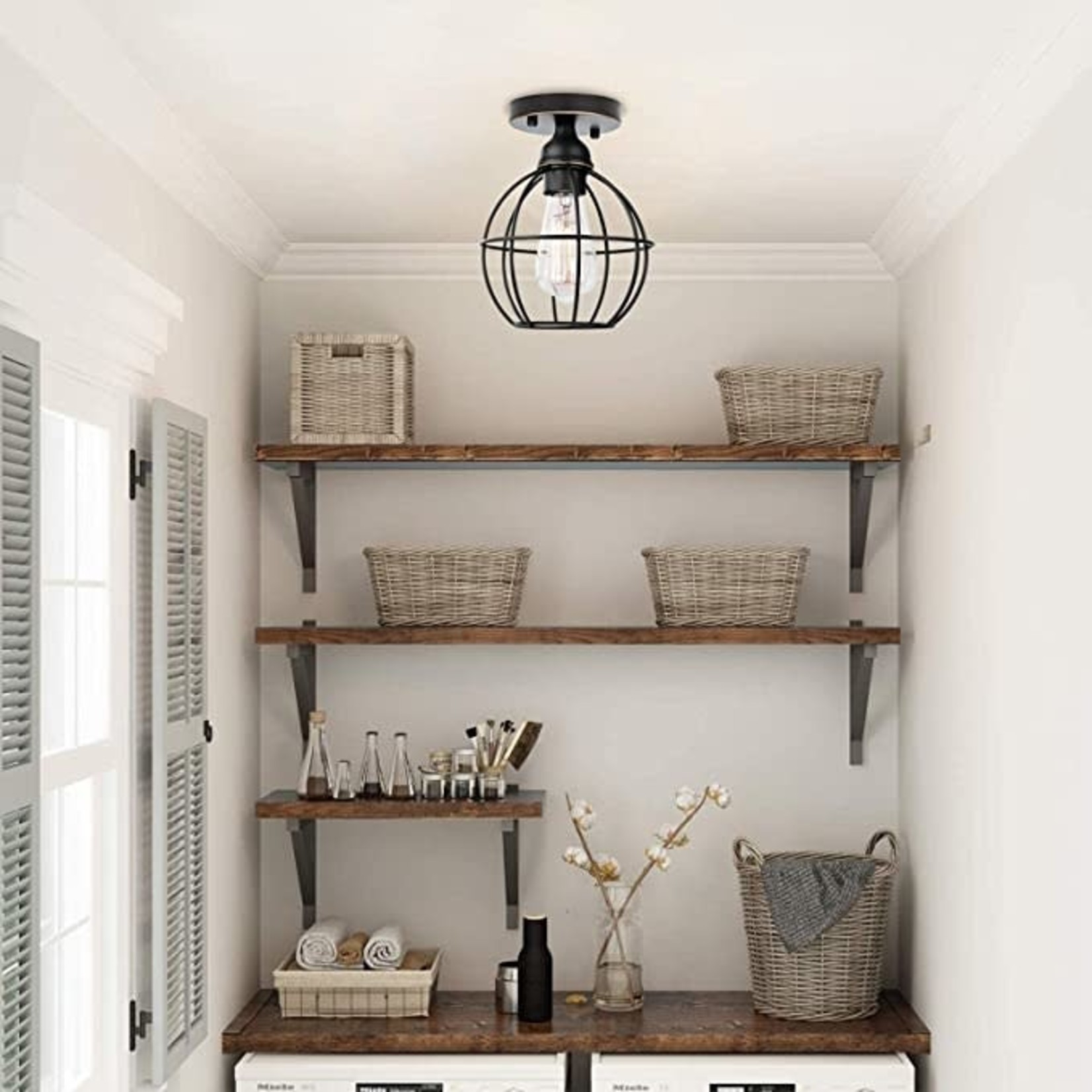 Black Flush Mount Ceiling Light- Vintage semi flush ceiling light crafted from metal, the cage-style frame features an open framework design. Elegant appearance fit for all types of decor.